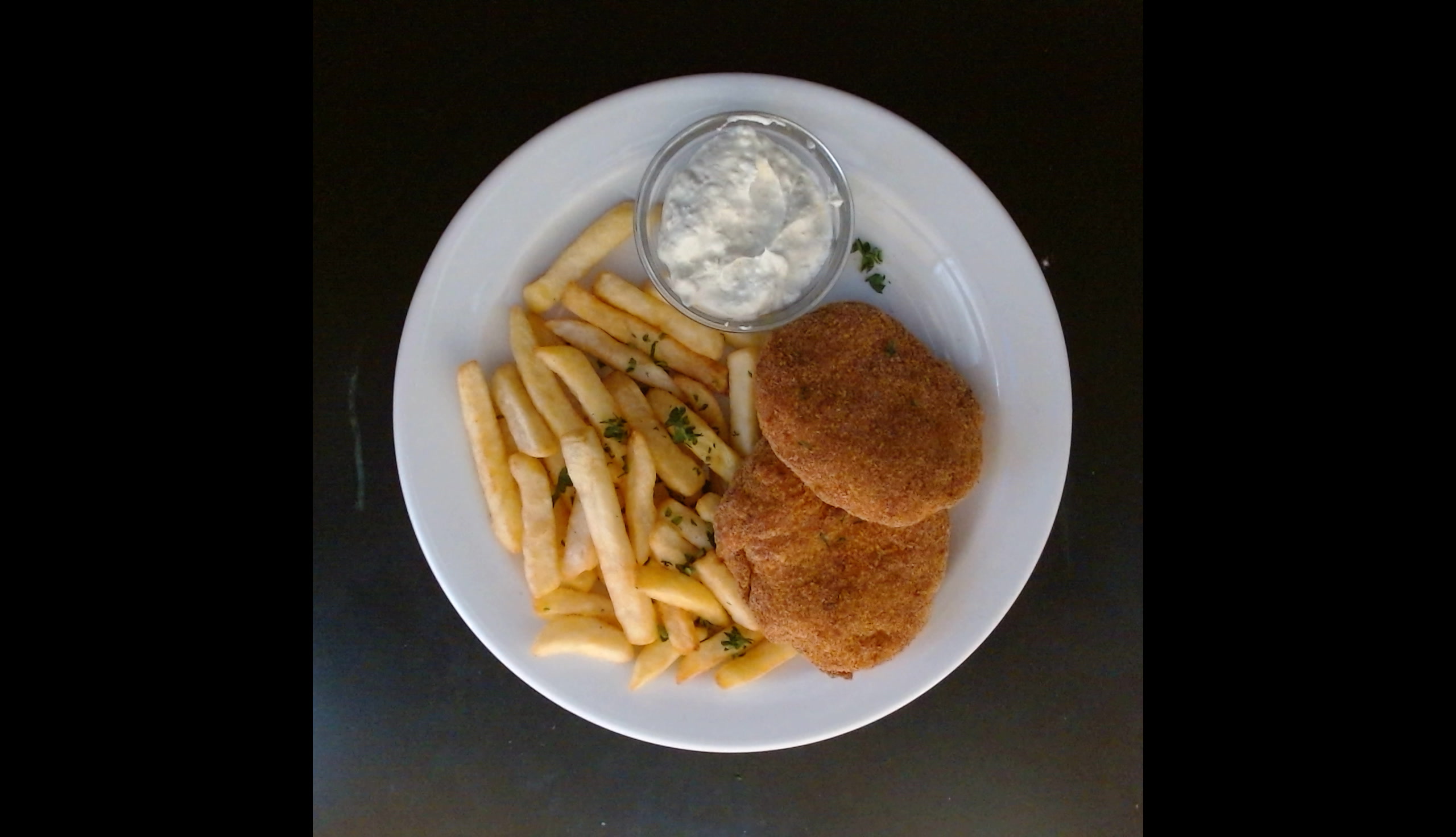 Smažené kuřecí frikadely se sýrem,bramborové hranolky,proteinový bylinkový dip