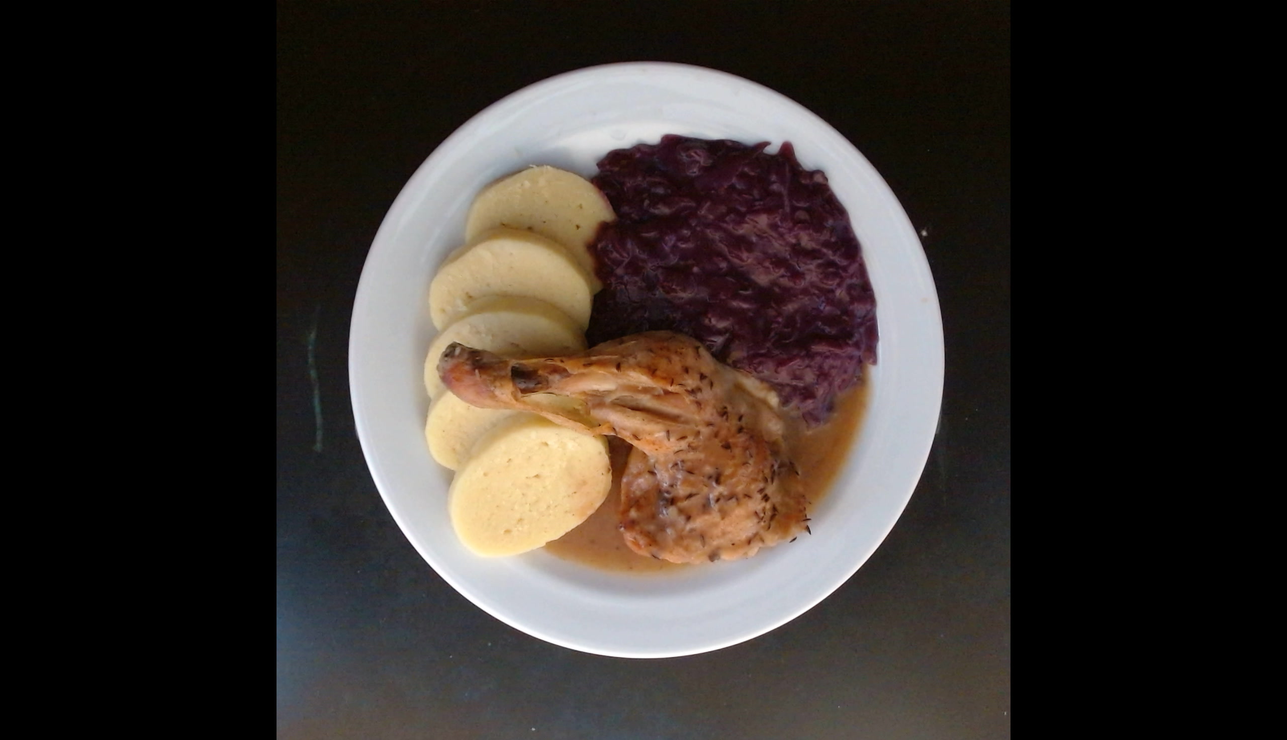 Kuřecí stehno pečené, červené zelí, bramborové knedlíky