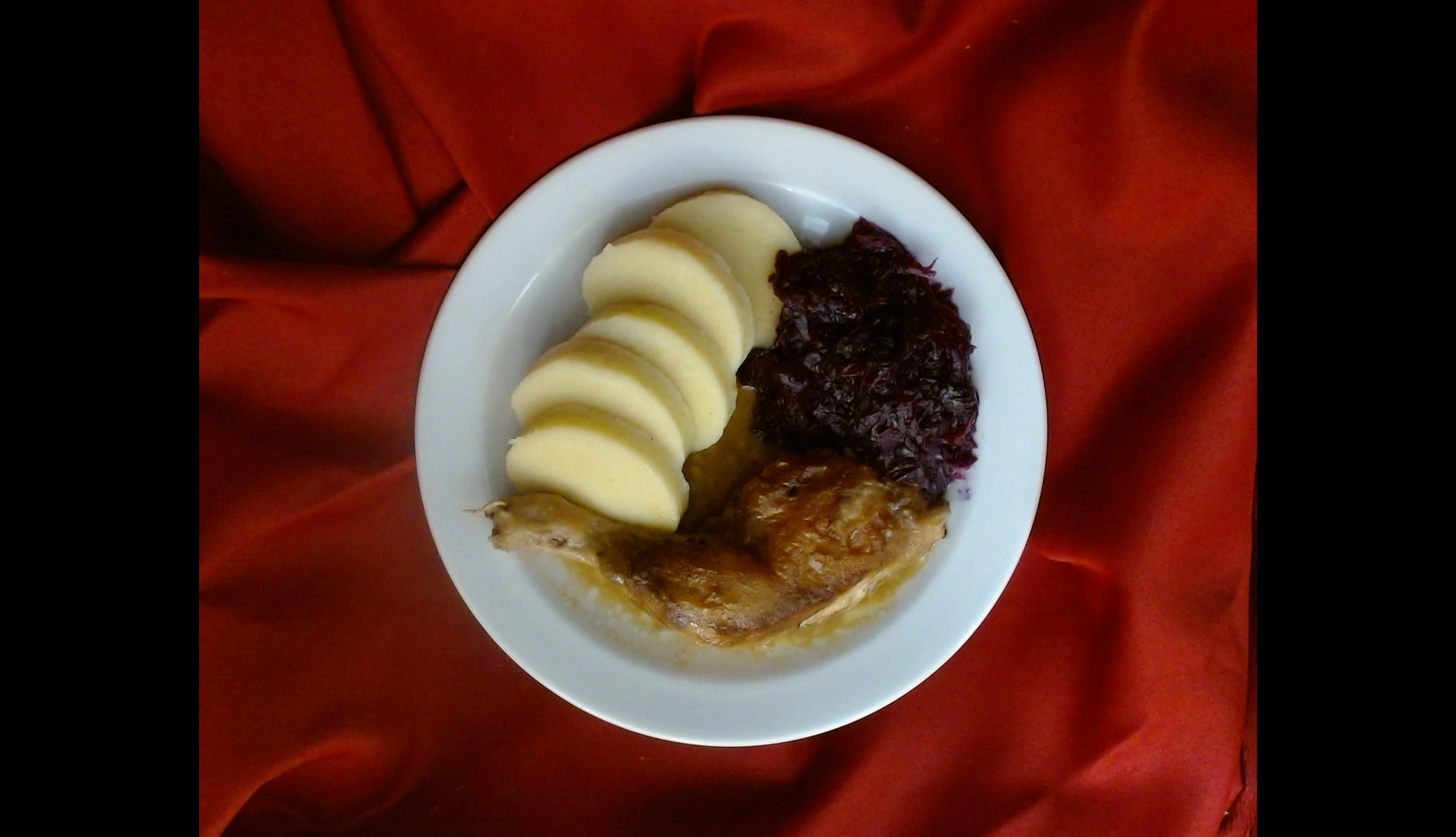 Kuřecí stehno pečené, červené zelí, bramborové knedlíky