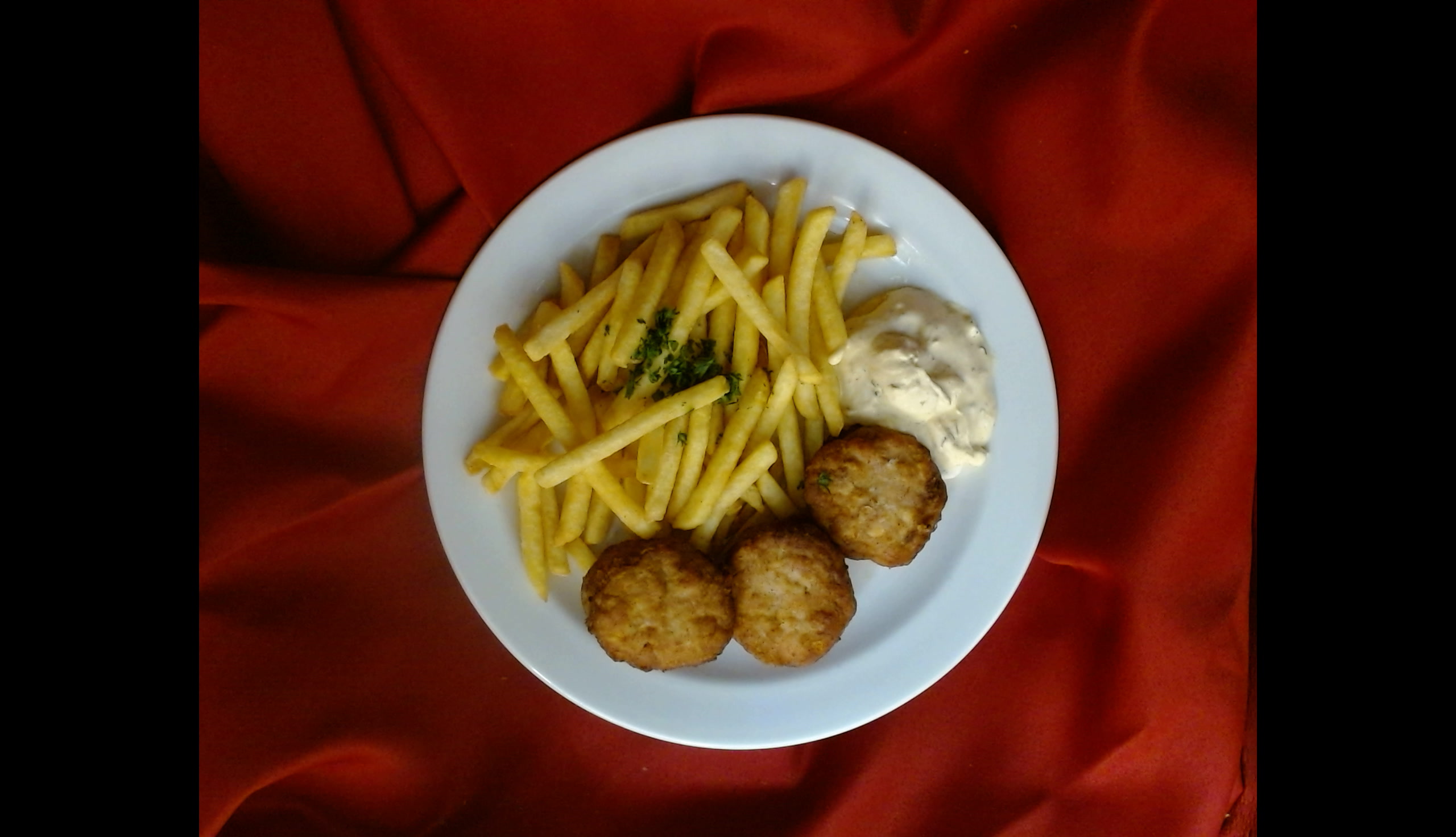 Smažené kuřecí frikadely se sýrem,bramborové hranolky,proteinový bylinkový dip