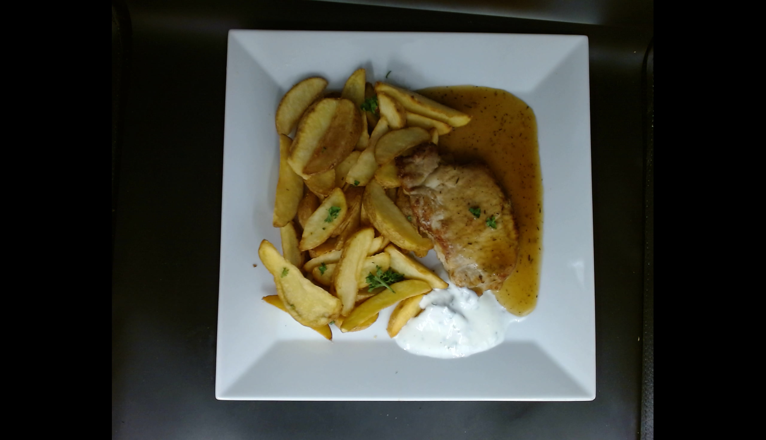 Vepřová kotleta na grilu, dip, americké brambory