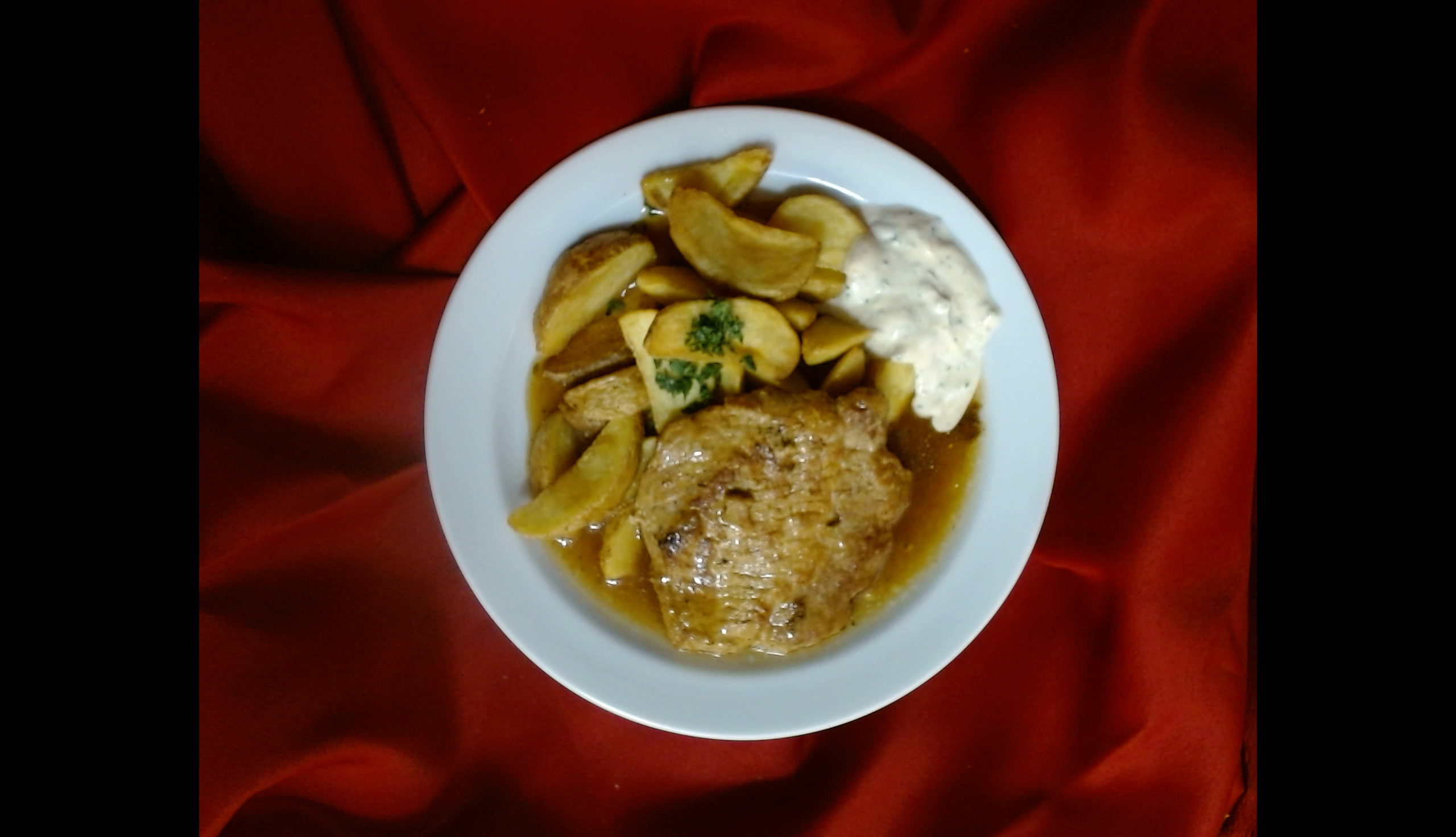 Vepřová kotleta na grilu, dip, americké brambory