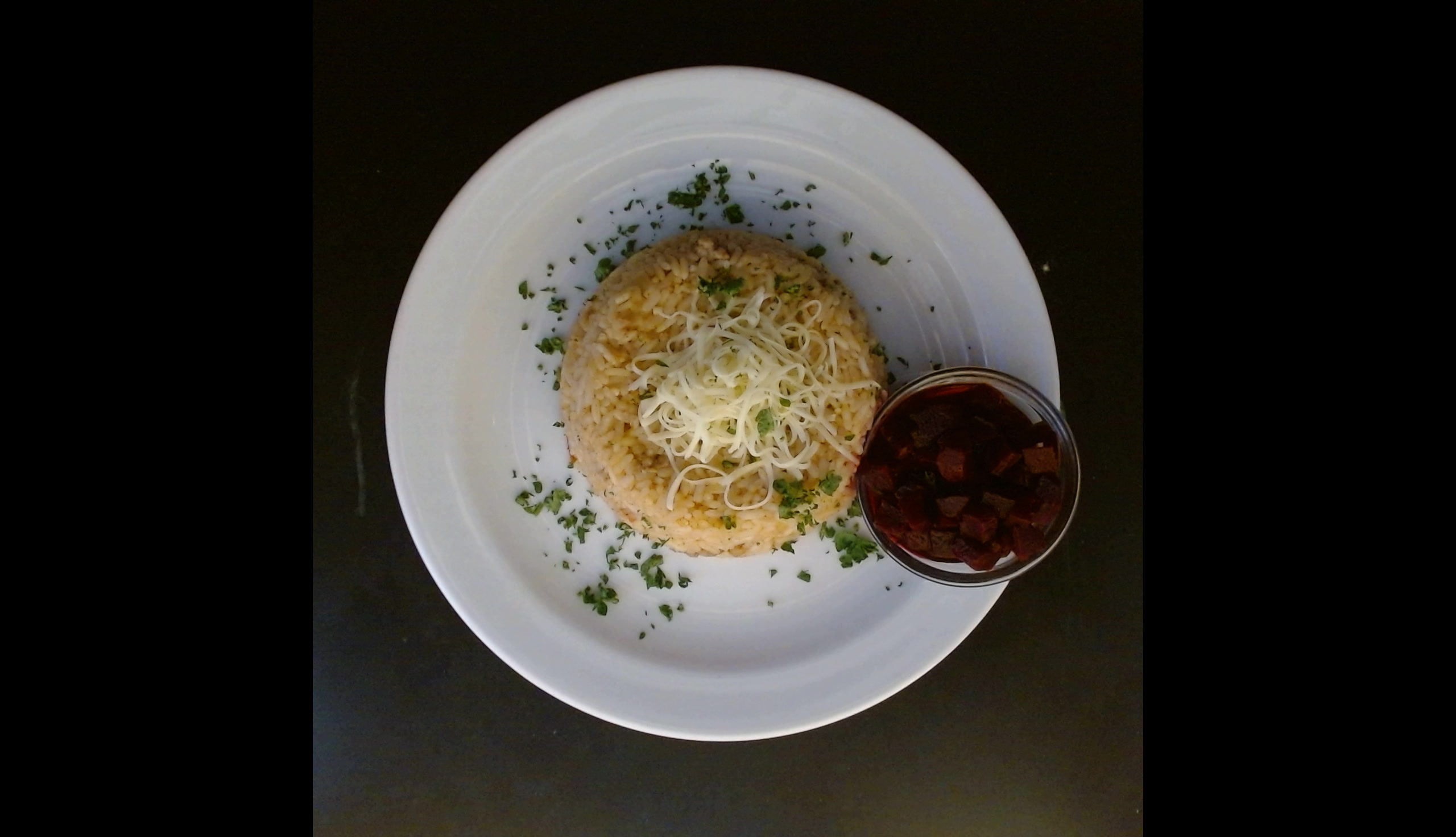 Srbské vepřové rizoto sypané sýrem, červená řepa sterilovaná