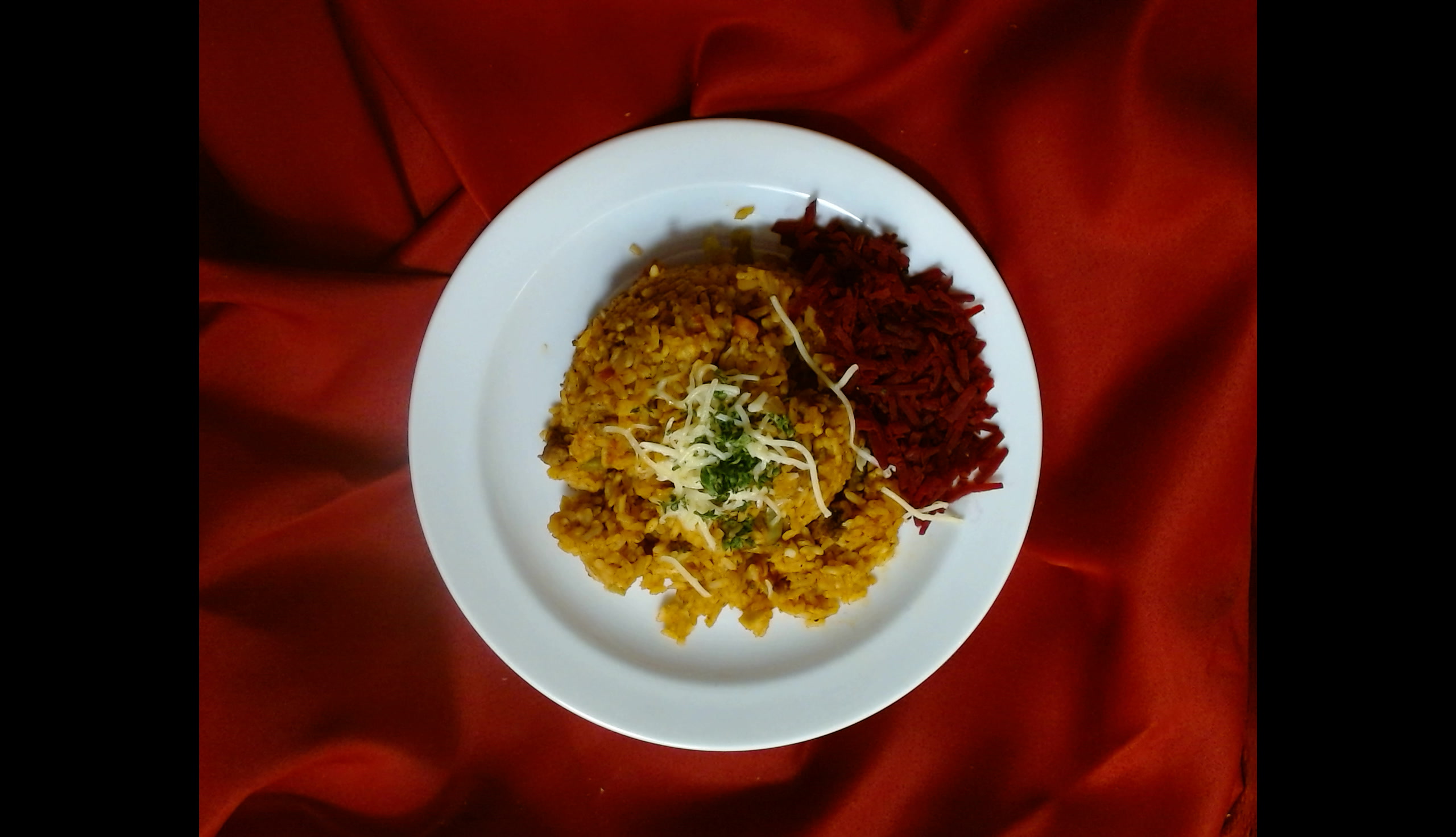 Srbské vepřové rizoto sypané sýrem, červená řepa sterilovaná