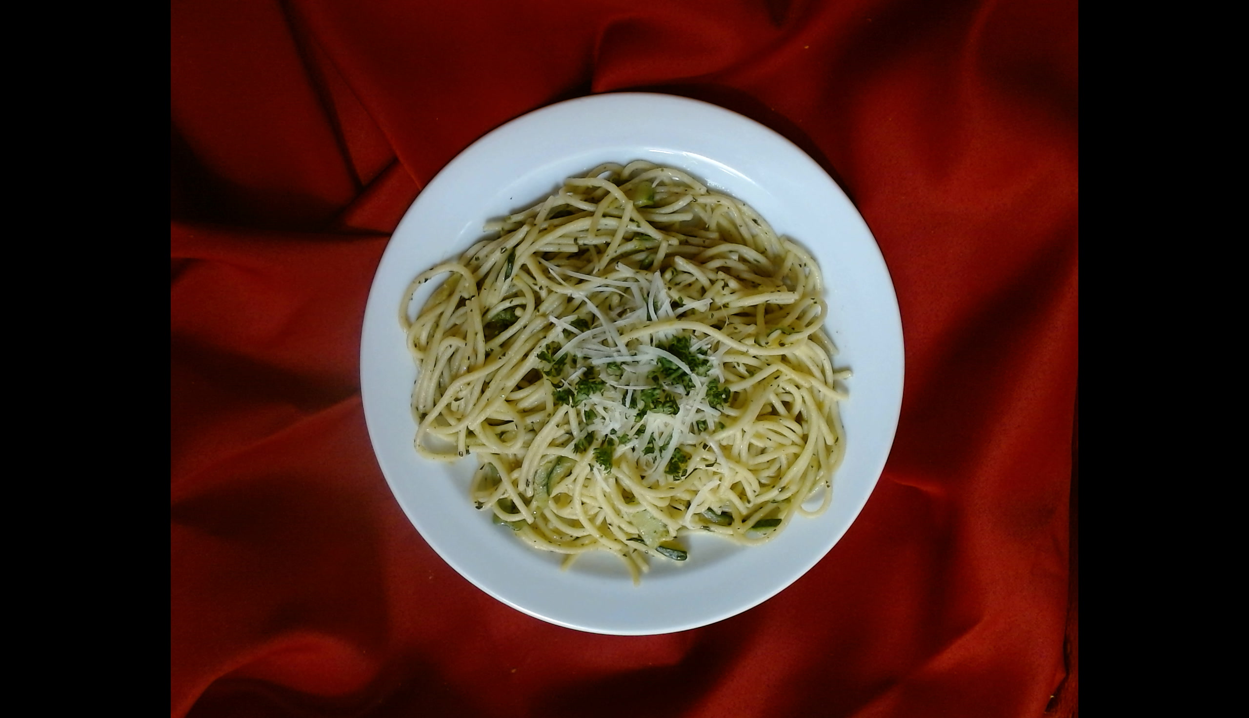 Špagety s bazalkovým pestem, cuketou a sýrem