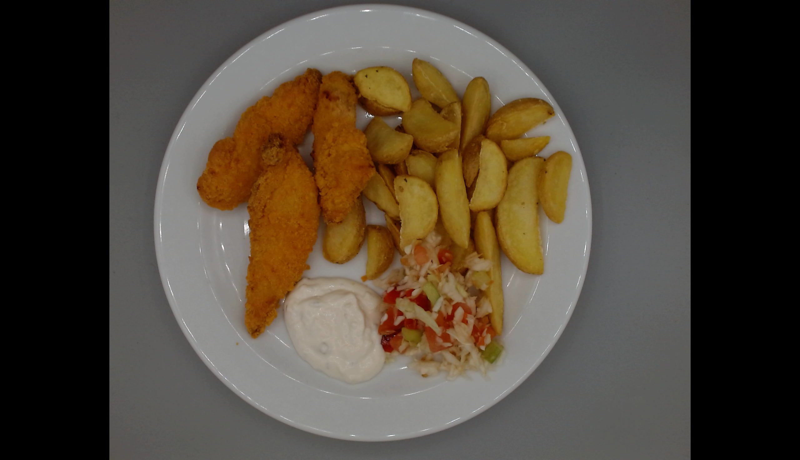 Kuřecí stripsy, americké brambory,tatarská omáčka, zeleninová přízdoba
