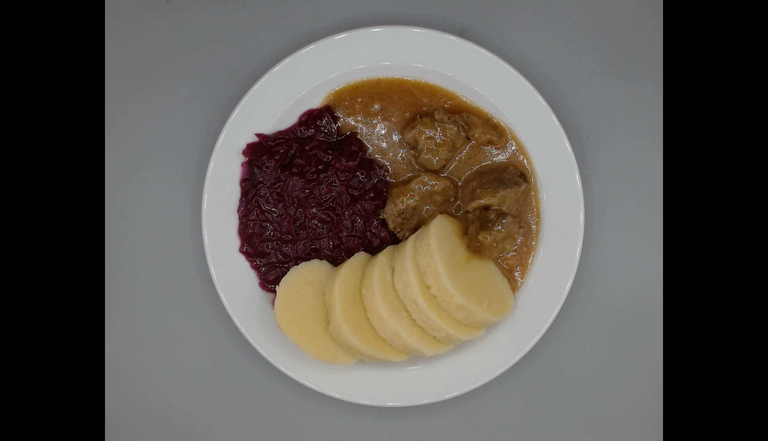 Krůtí vrabec na česneku, bramborové knedlíky, červené zelí