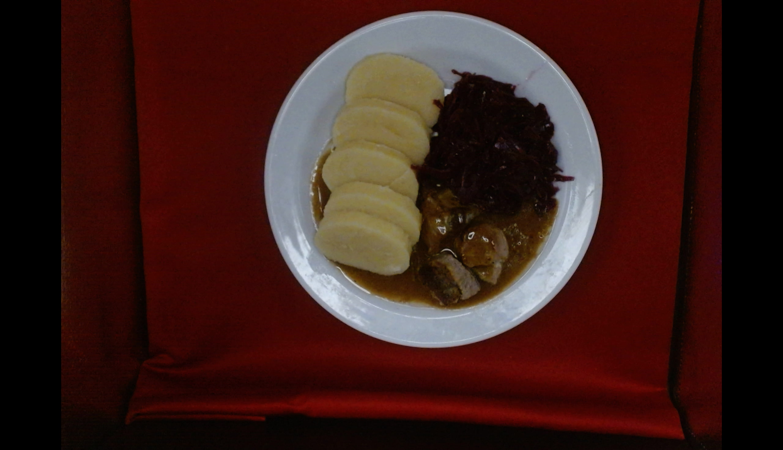 Krůtí vrabec na česneku, bramborové knedlíky, červené zelí