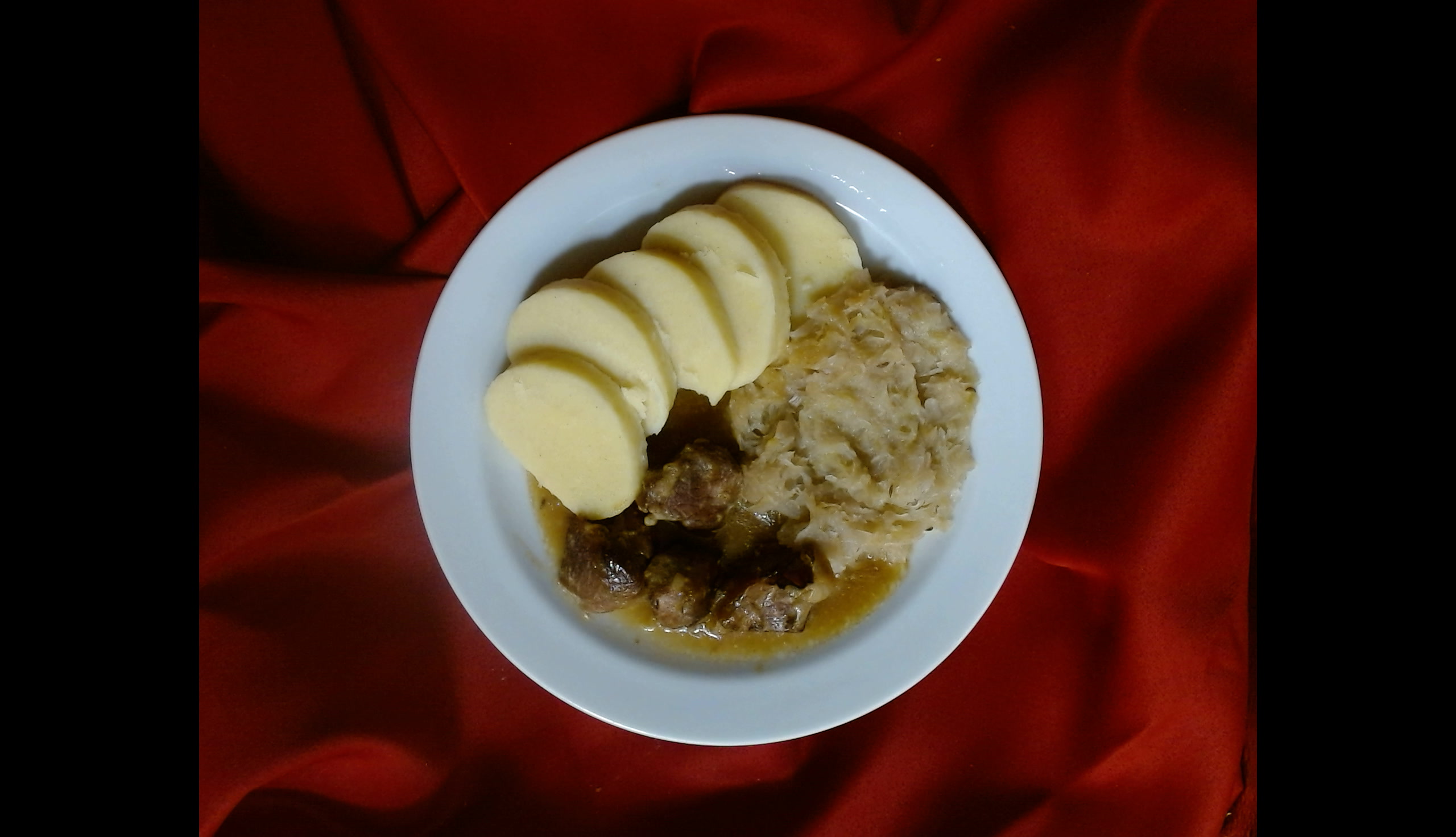 Krůtí vrabec na česneku, bramborové knedlíky, dušené zelí