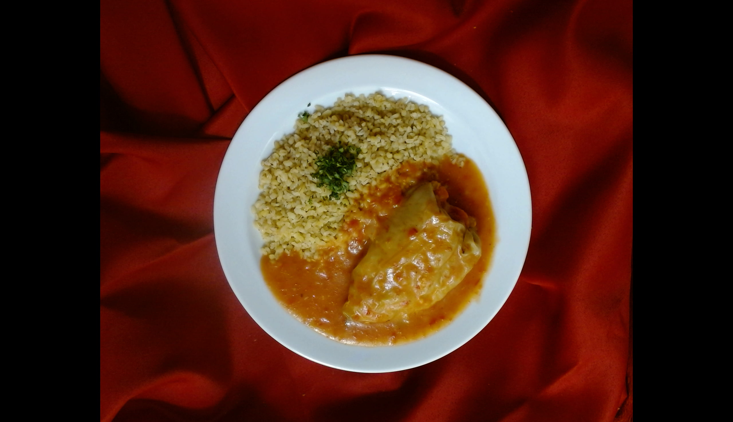 Plněné papriky s rajčatovou omáčkou, bulgur