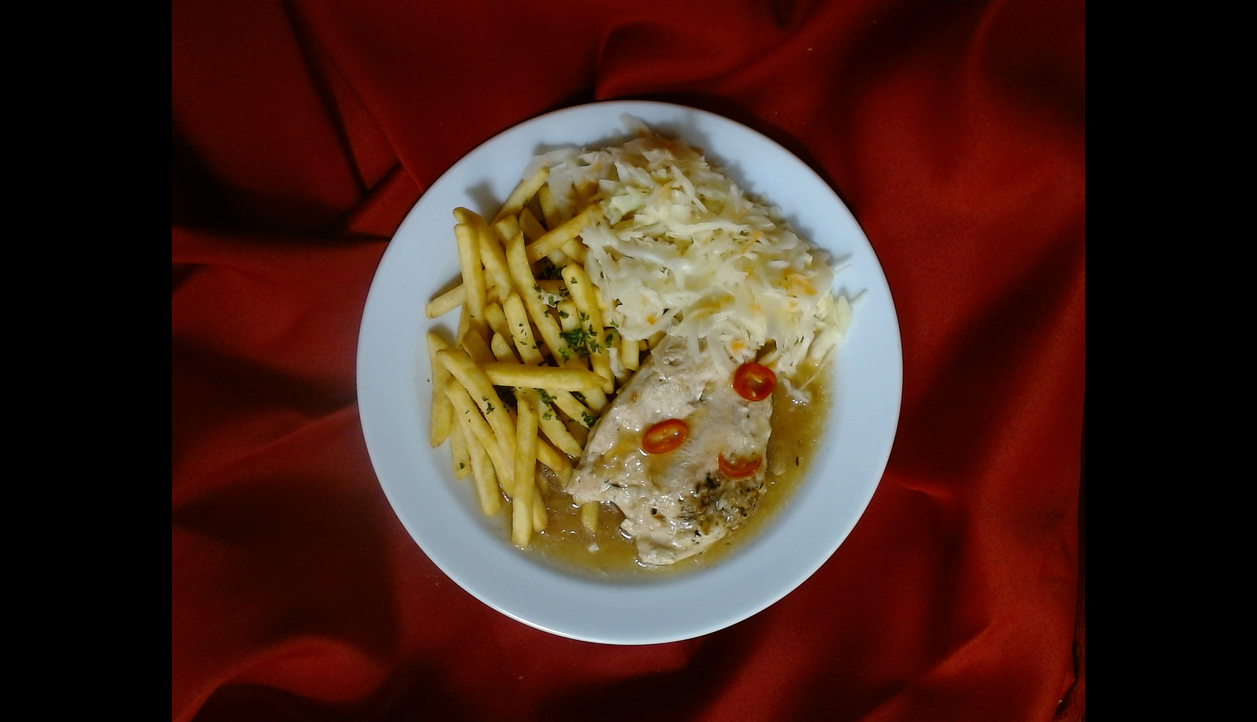 Kuřecí steak s jalapeňos, zelný salát s ředkvičkami, hranolky