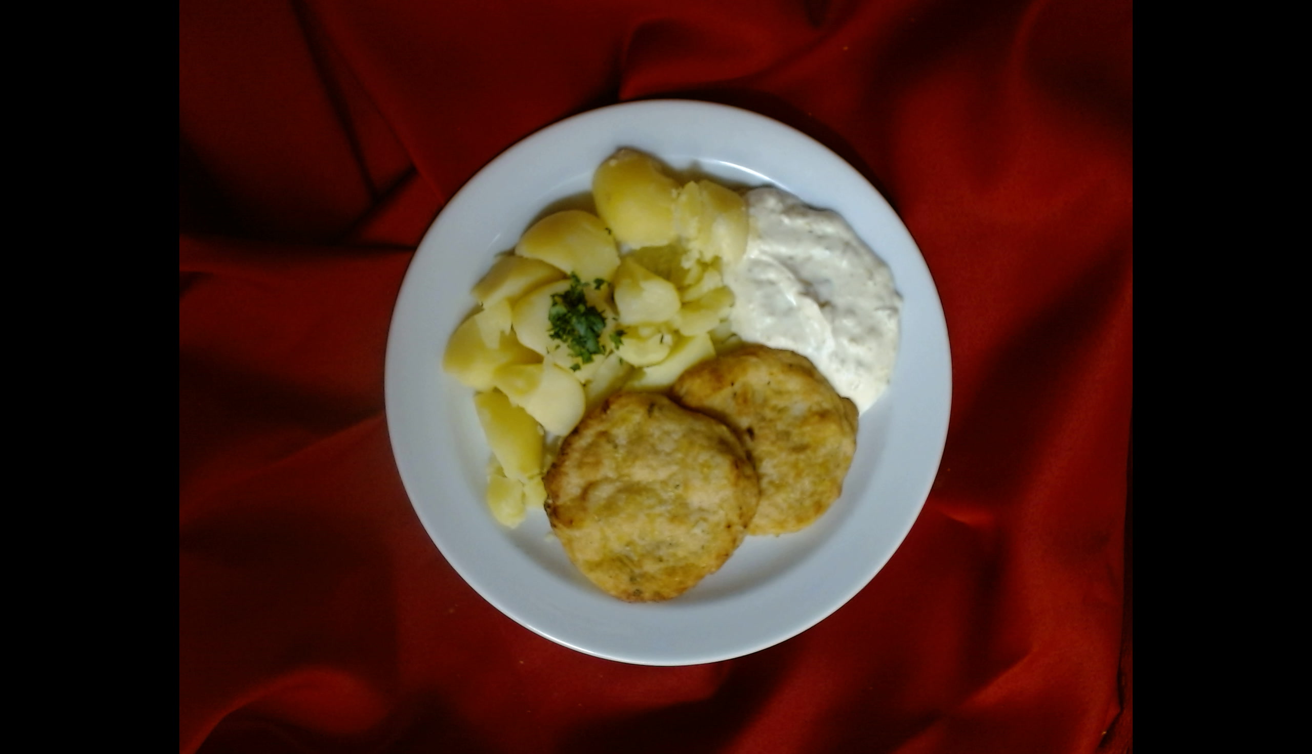 Květákové placičky se sýrem, vařené brambory, tatarská omáčka
