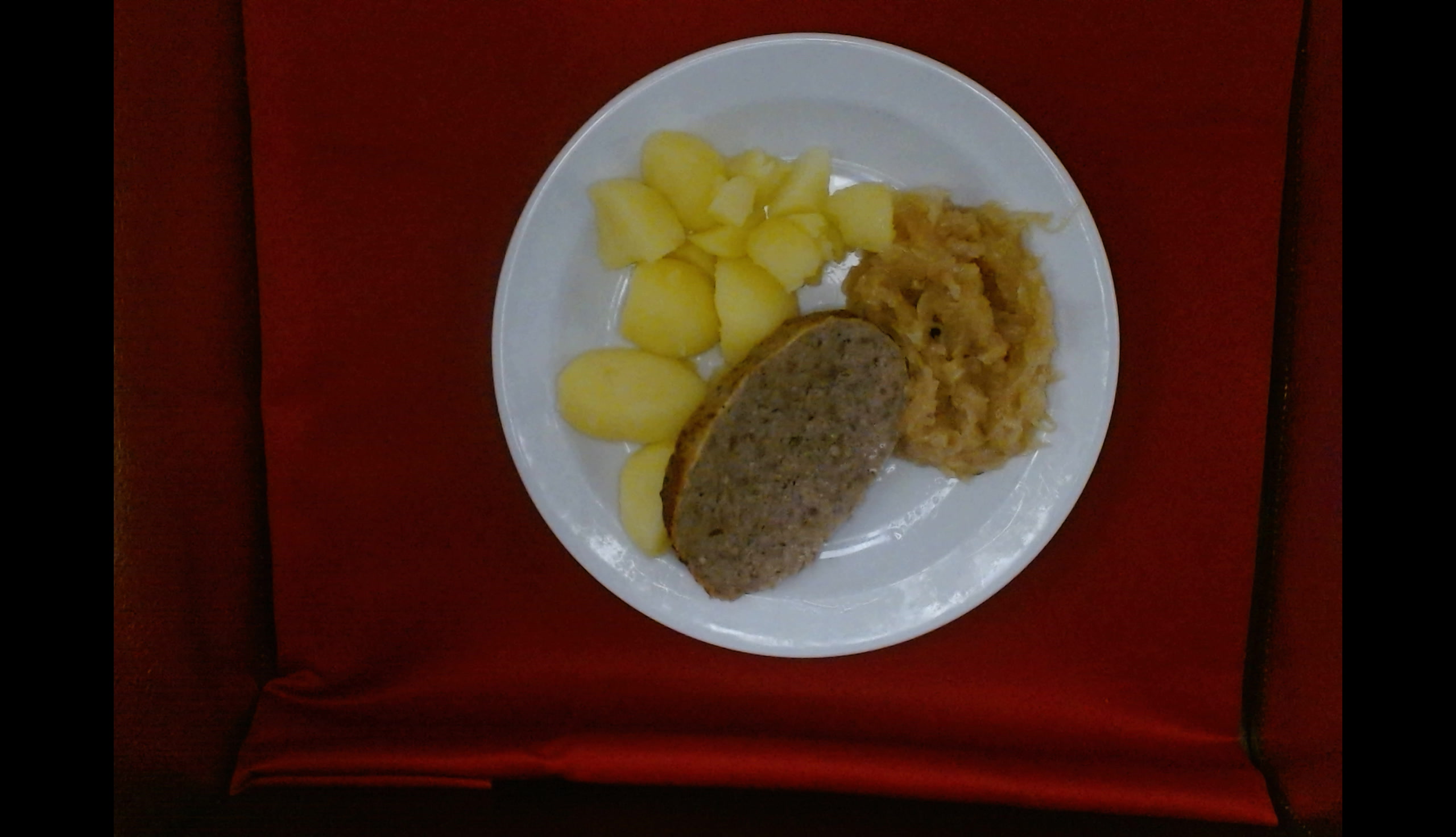 Sekaná pečeně, vařené brambory, dušené kysané zelí