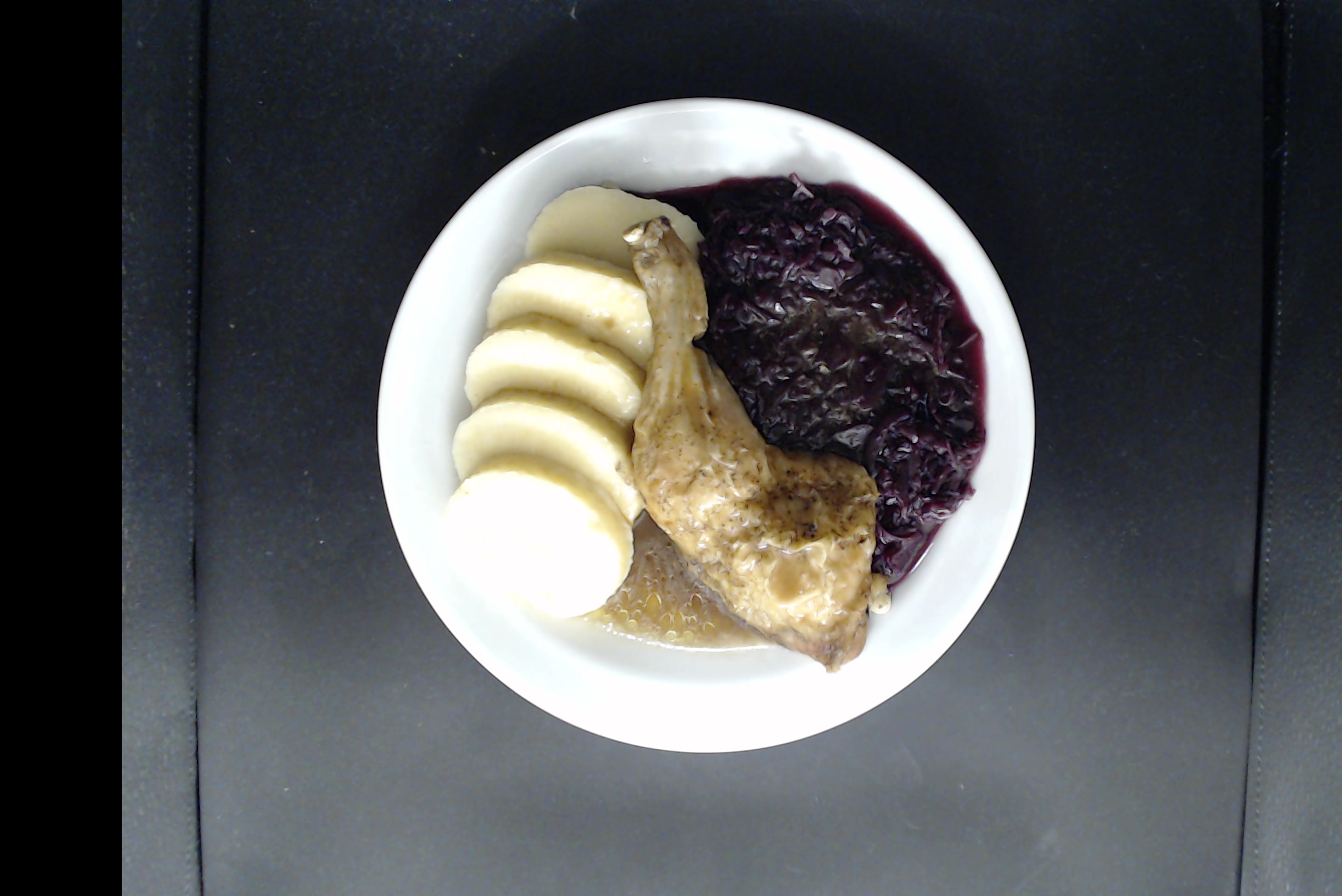 Pečené kuřecí stehno na divoko, dušené zelí, bramborový knedlík