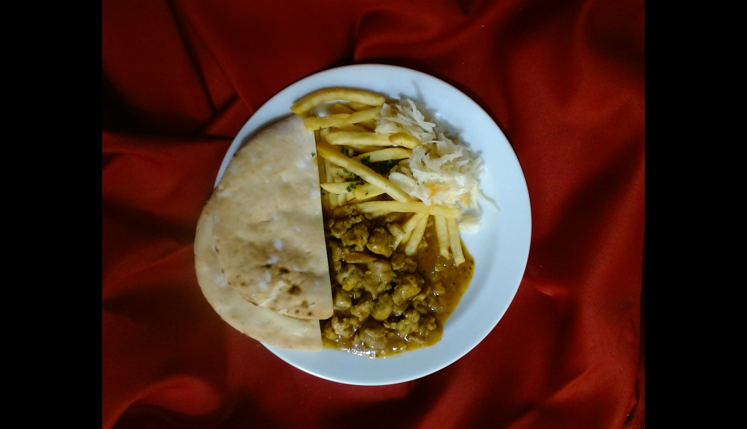 Krůtí gyros, pita chléb, 1/2 hranolky, zelný salát s ředkvičkou