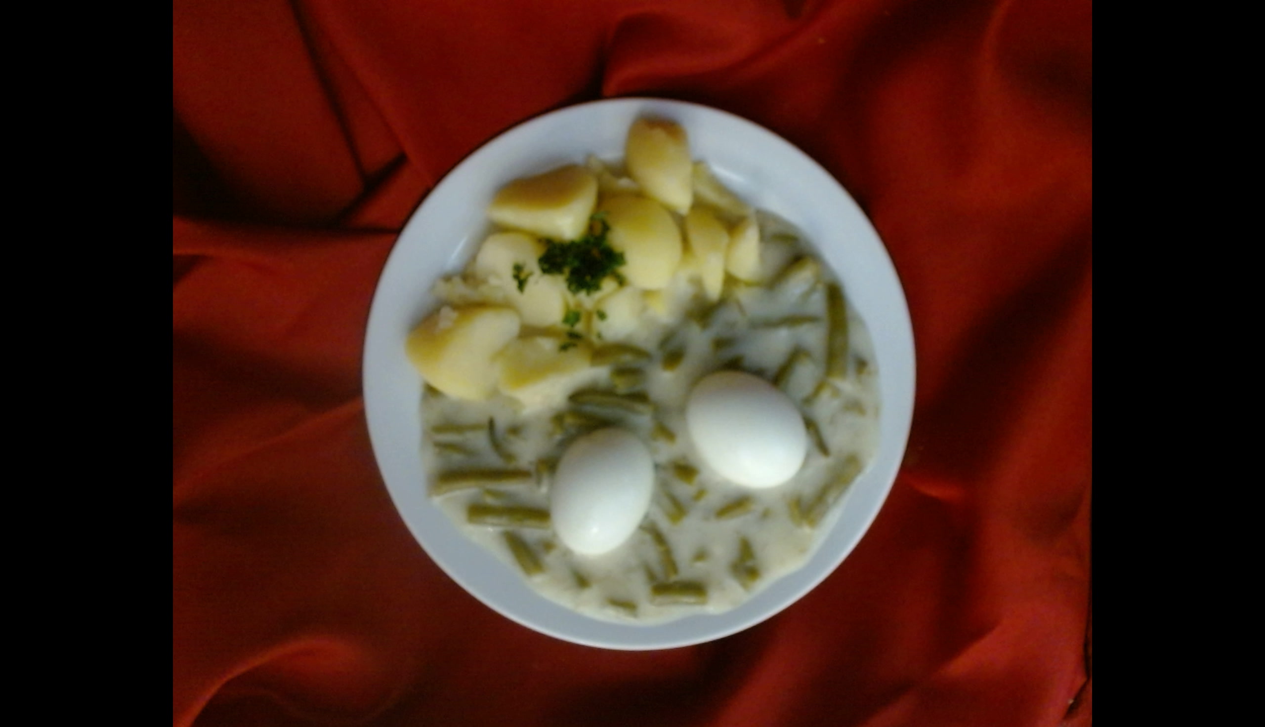 Fazolky na smetaně s koprem, 2 ks vařené vejce, brambory