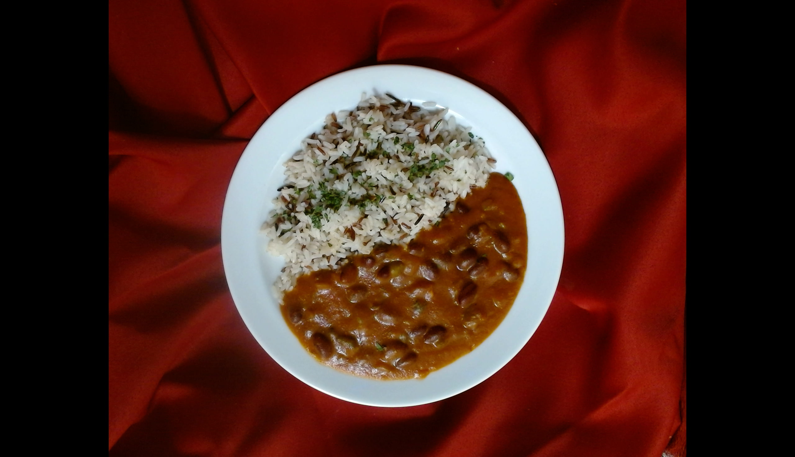 Fazolový stroganoff, tříbarevná rýže