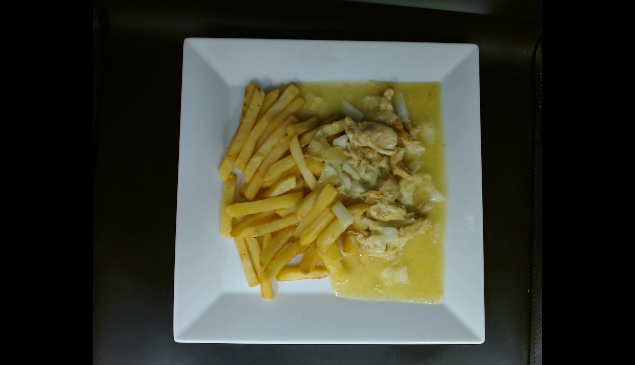 Kuřecí indické soté, bramborové hranolky