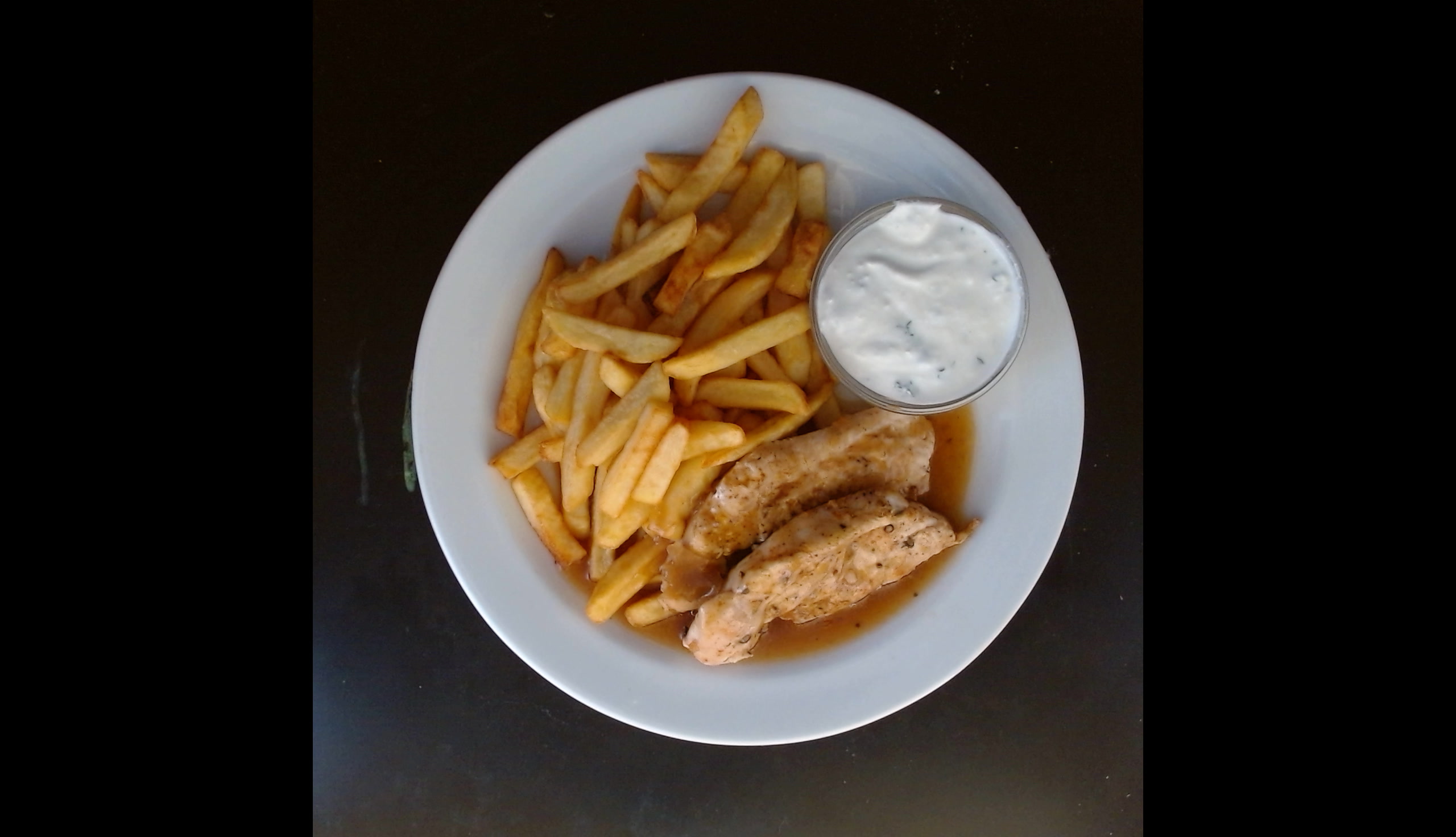 Kuřecí medailonky, bramborové hranolky, proteinový bylinkový dip