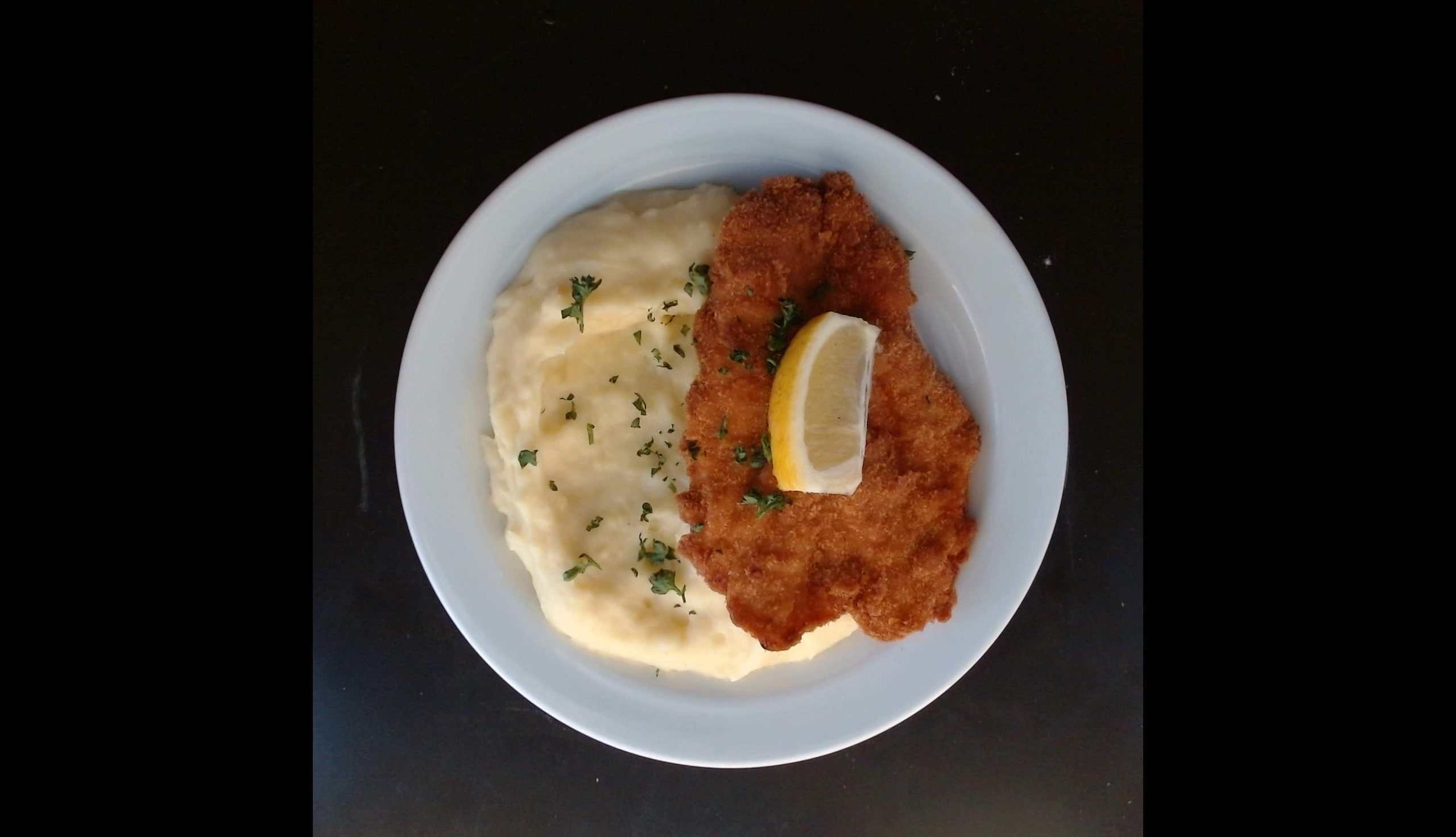 Smažený kuřecí řízek, bramborová kaše, citron