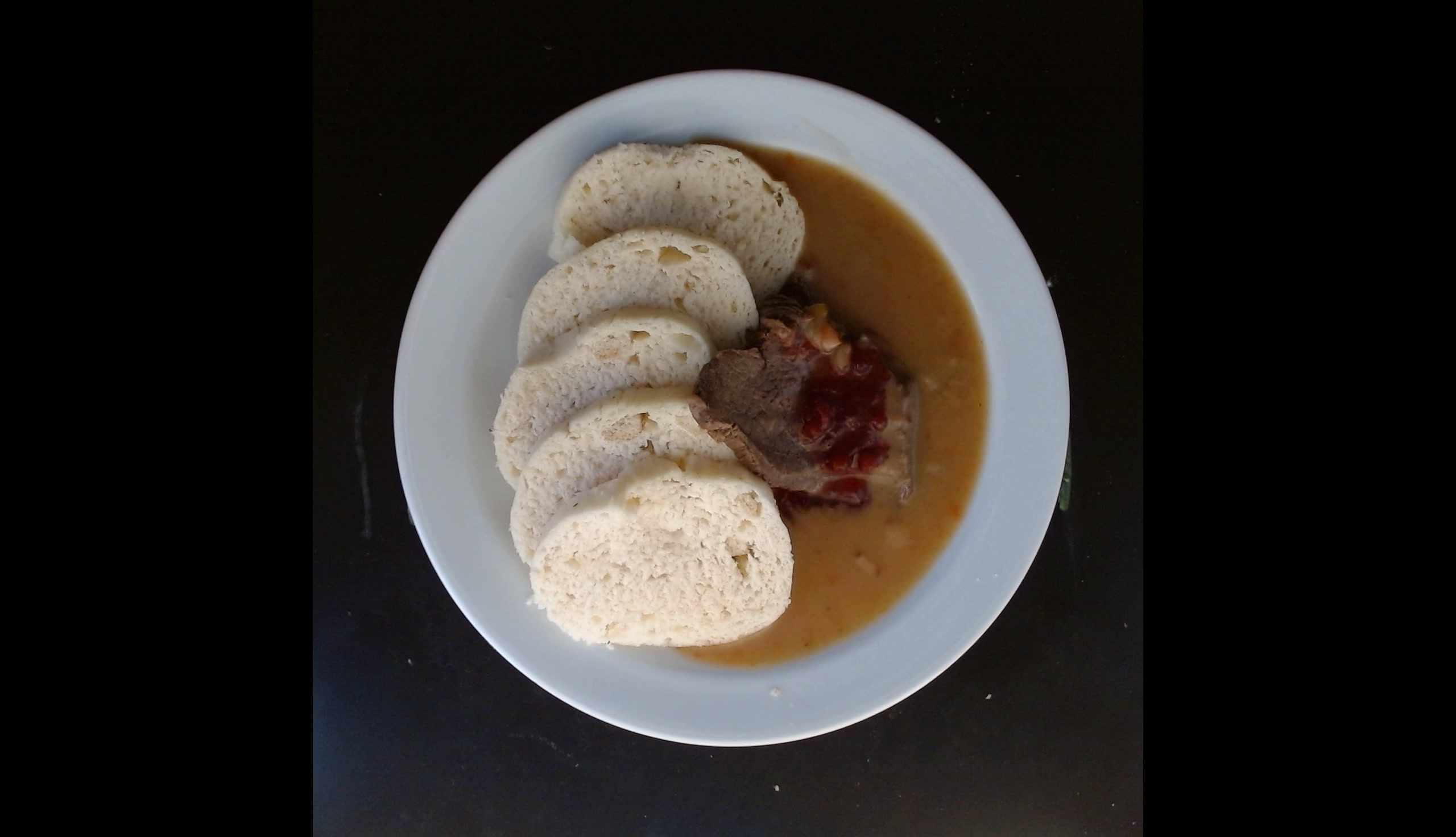Svíčková hovězí pečeně na smetaně, brusinky, houskové knedlíky