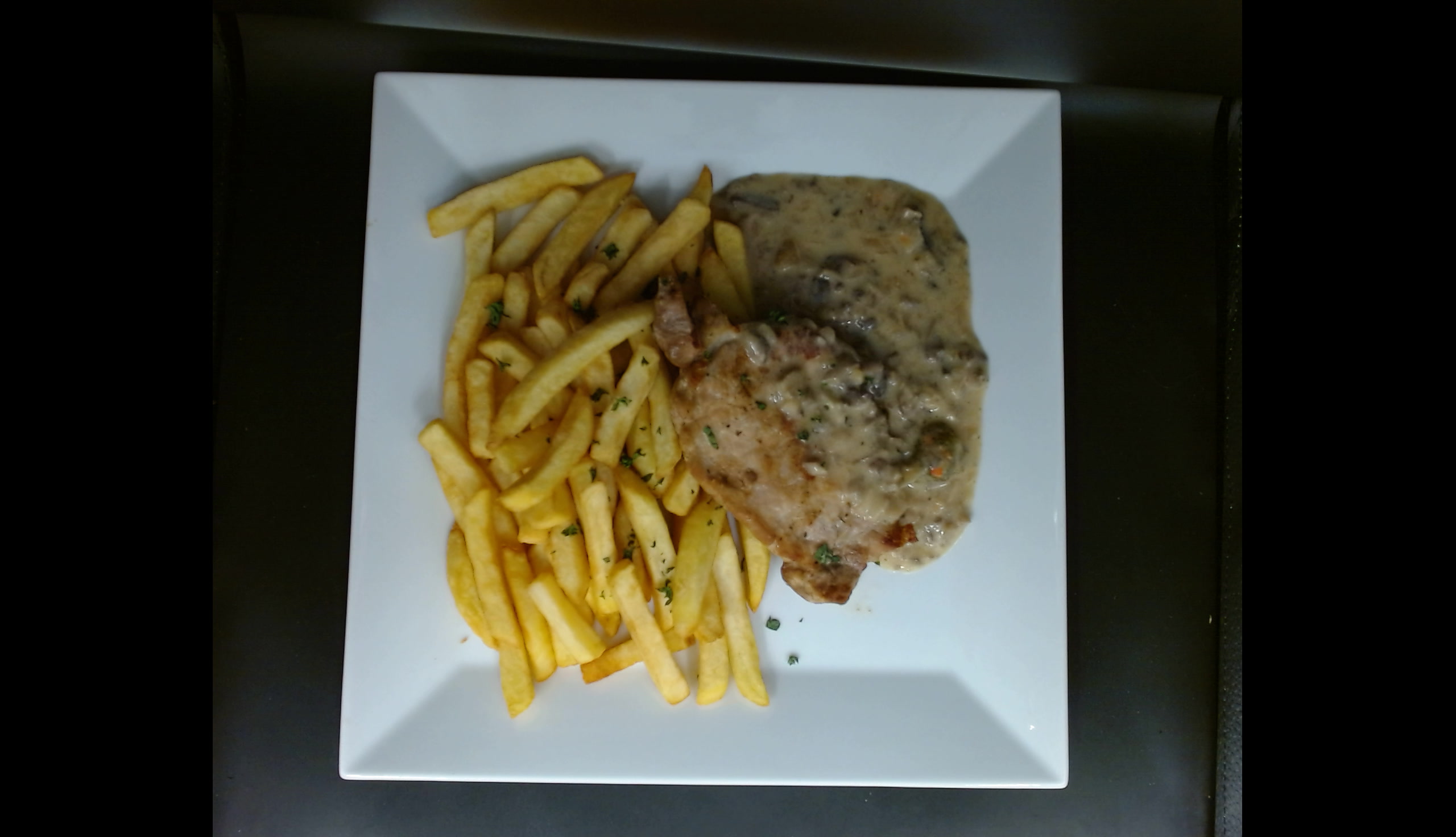 Vepřový steak se žampionovým přelivem,bramborové hranolky