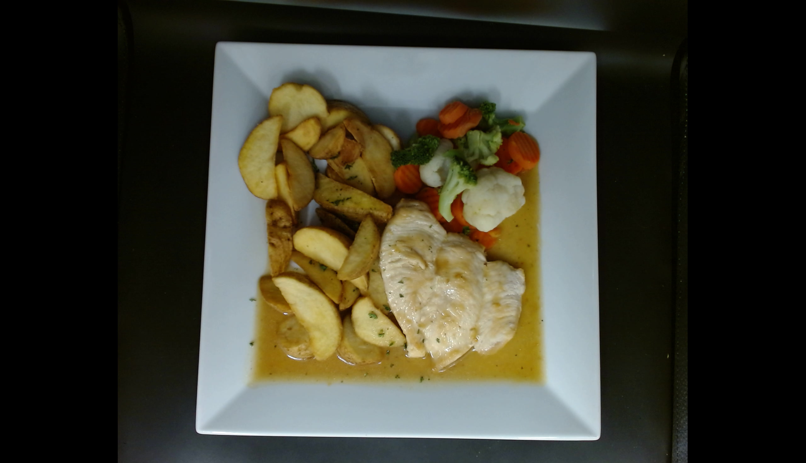 Kuřecí steak, bretaňská zelenina na másle, americké brambory