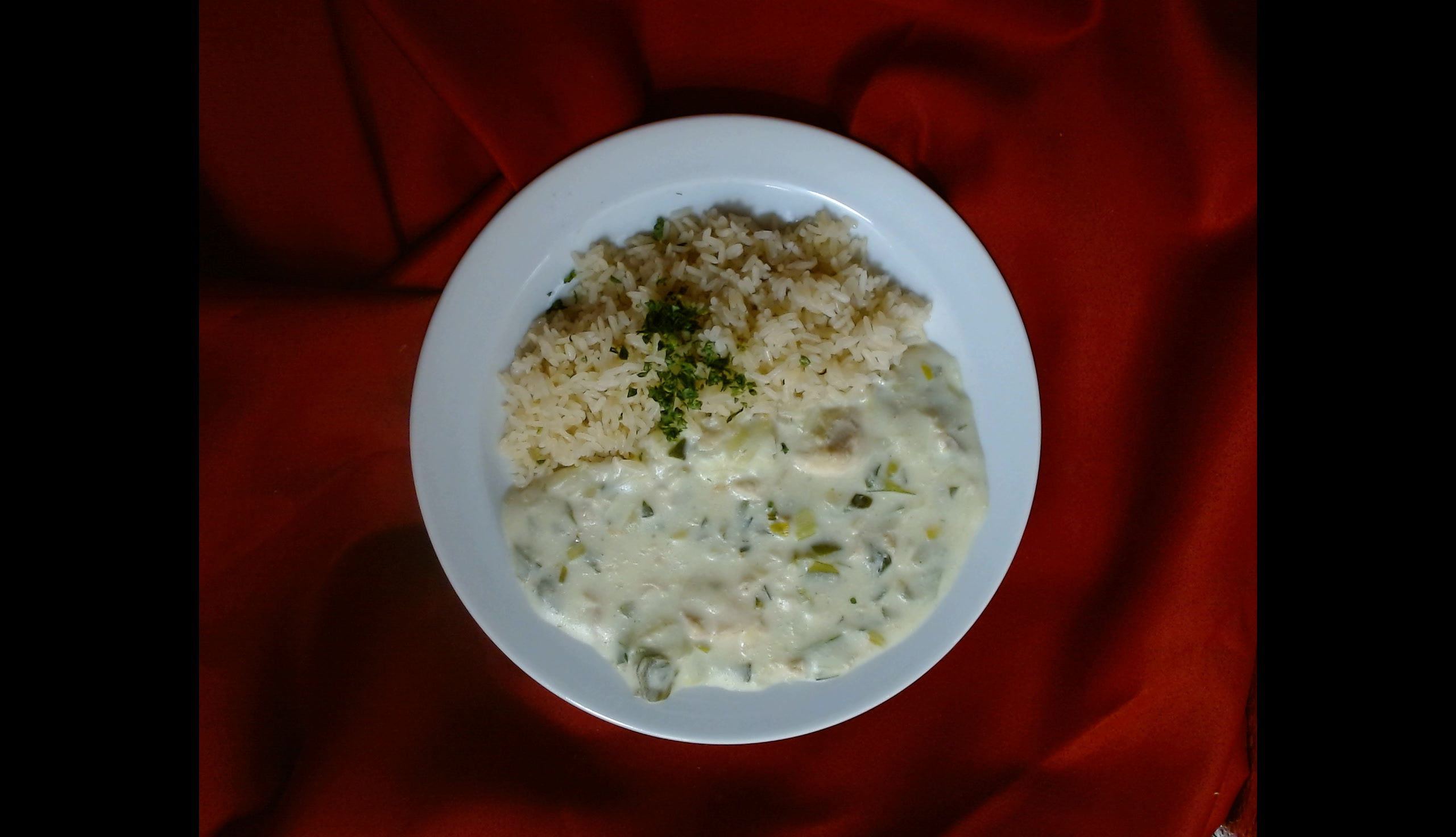 Kuřecí kousky na pórku a smetaně, dušená rýže