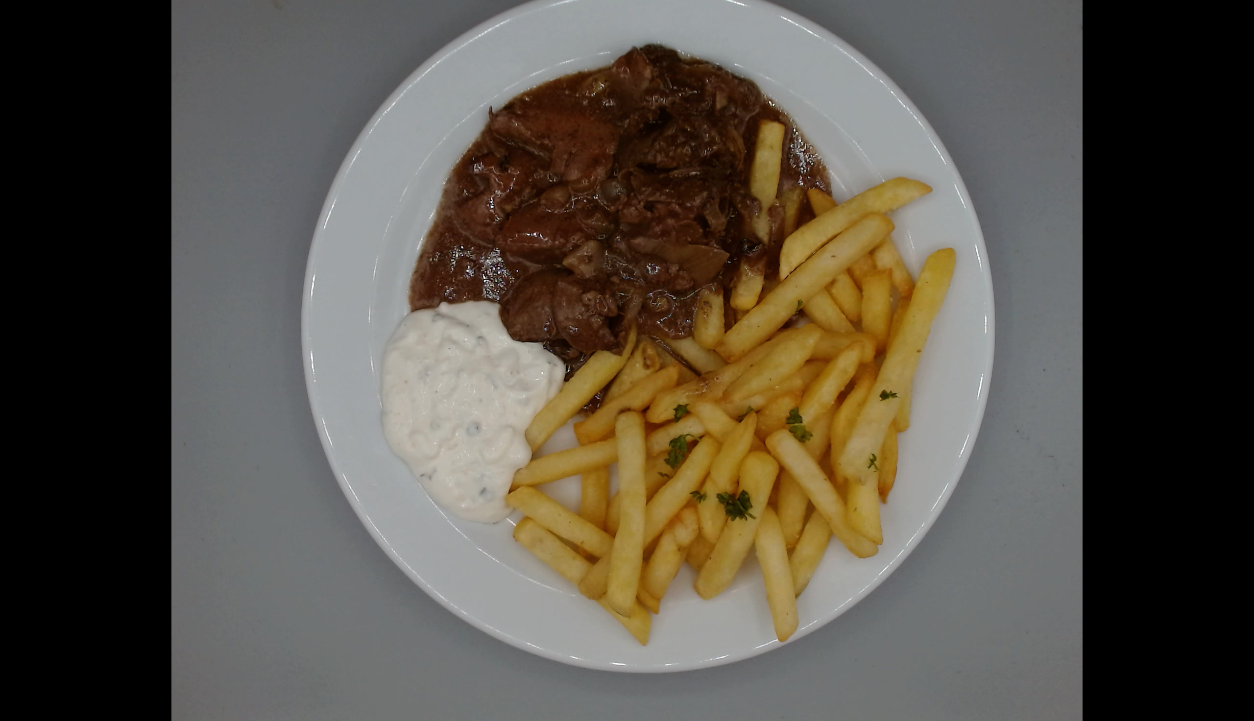 Kuřecí játra na cibulce, bramborové hranolky, tatarská omáčka