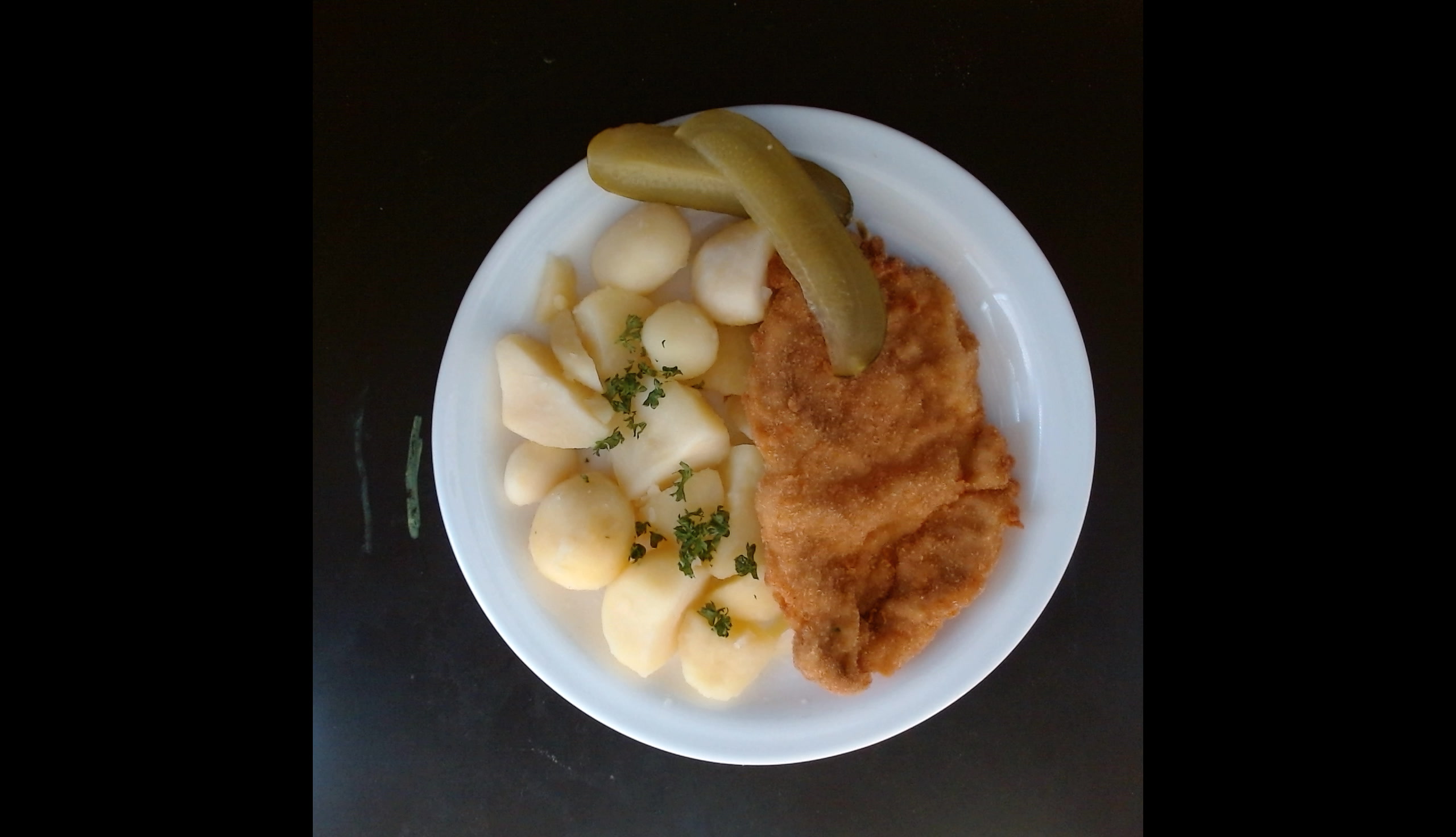 Smažený vepřový řízek,vařené brambory, okurka