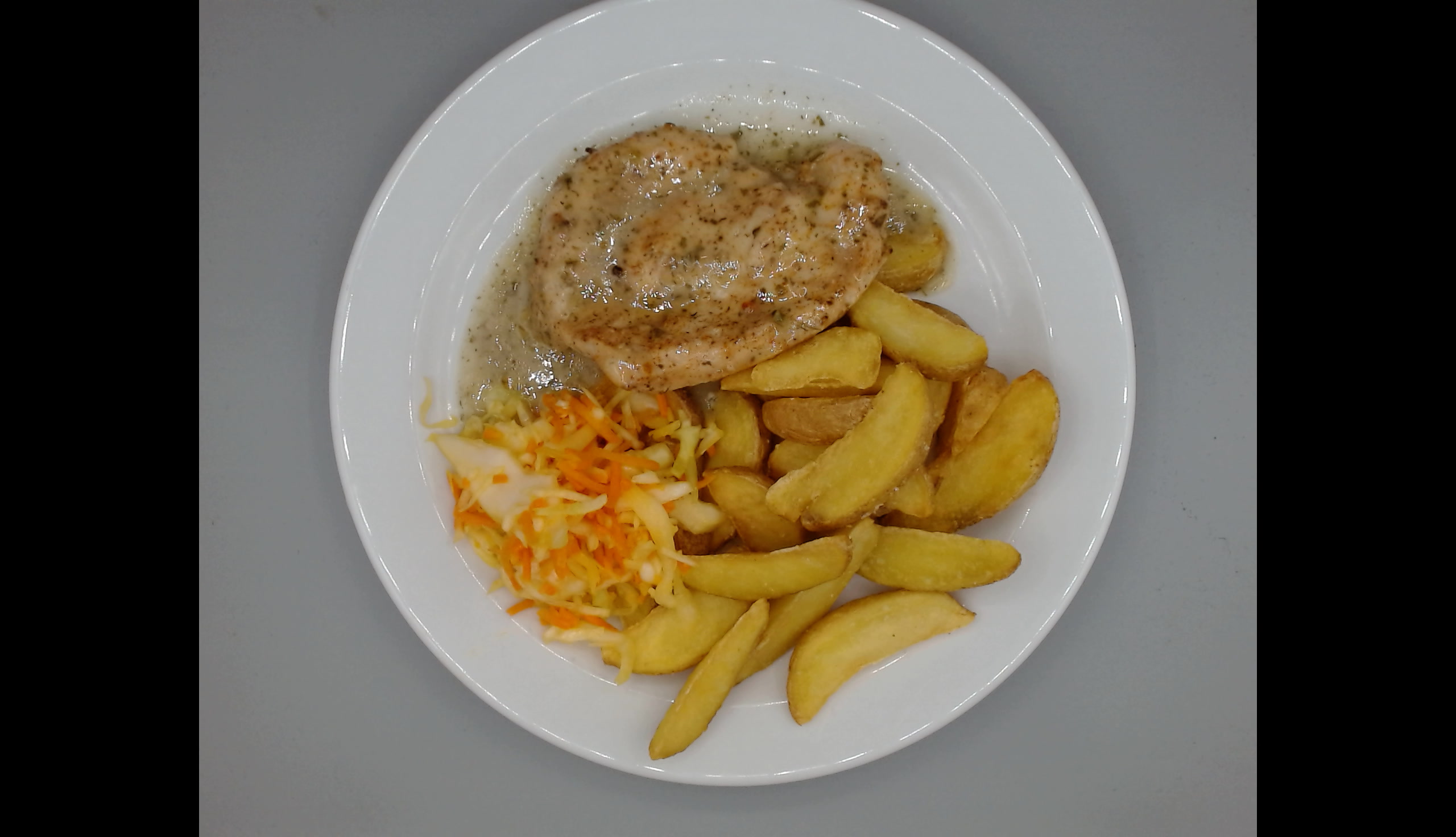 Kuřecí steak na bylinkách, americké brambory, zeleninová obloha