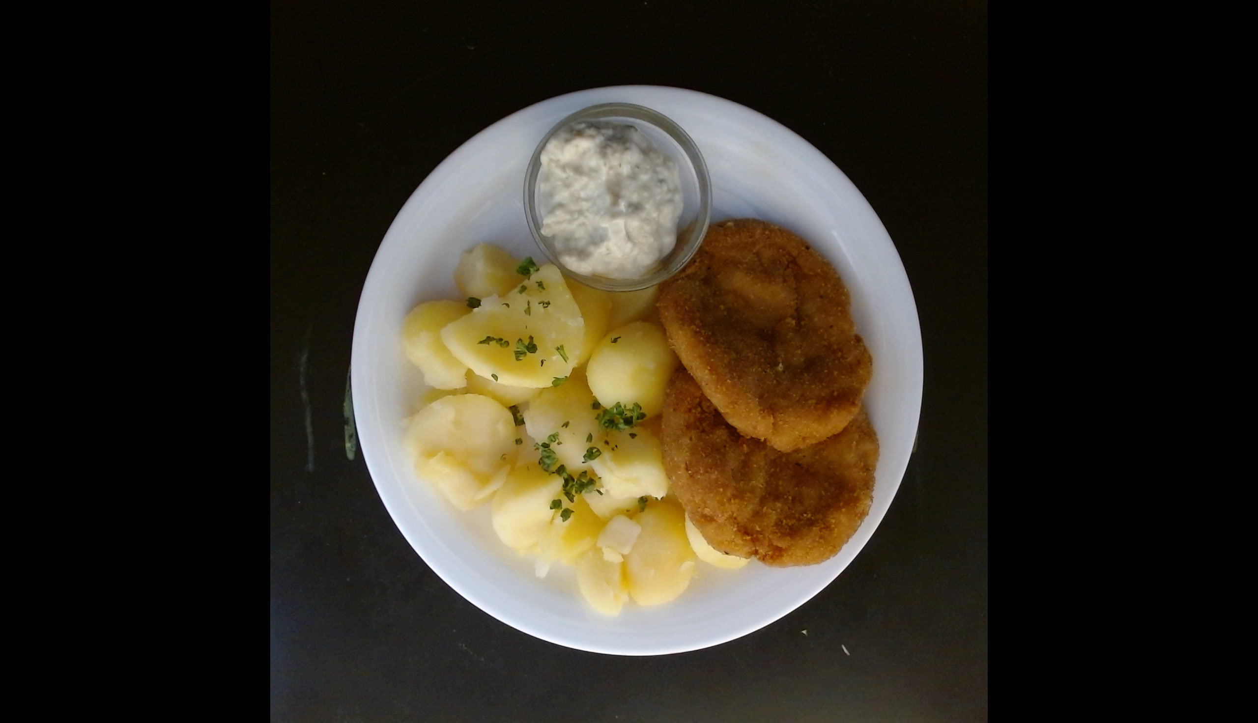 Květákové placičky se sýrem, vařené brambory, tatarská omáčka