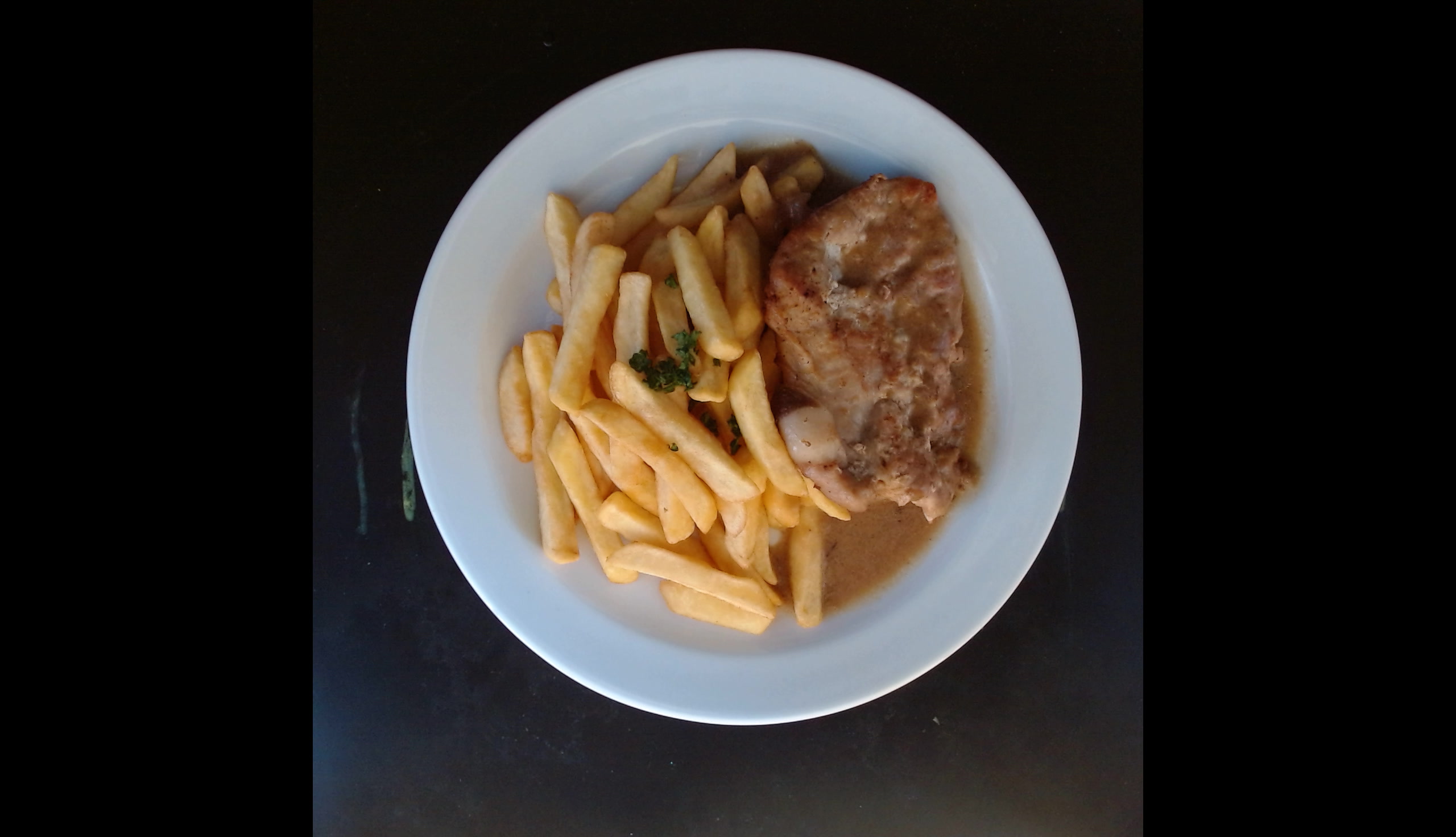 Vepřová kotleta s hořčičnou omáčkou, hranolky