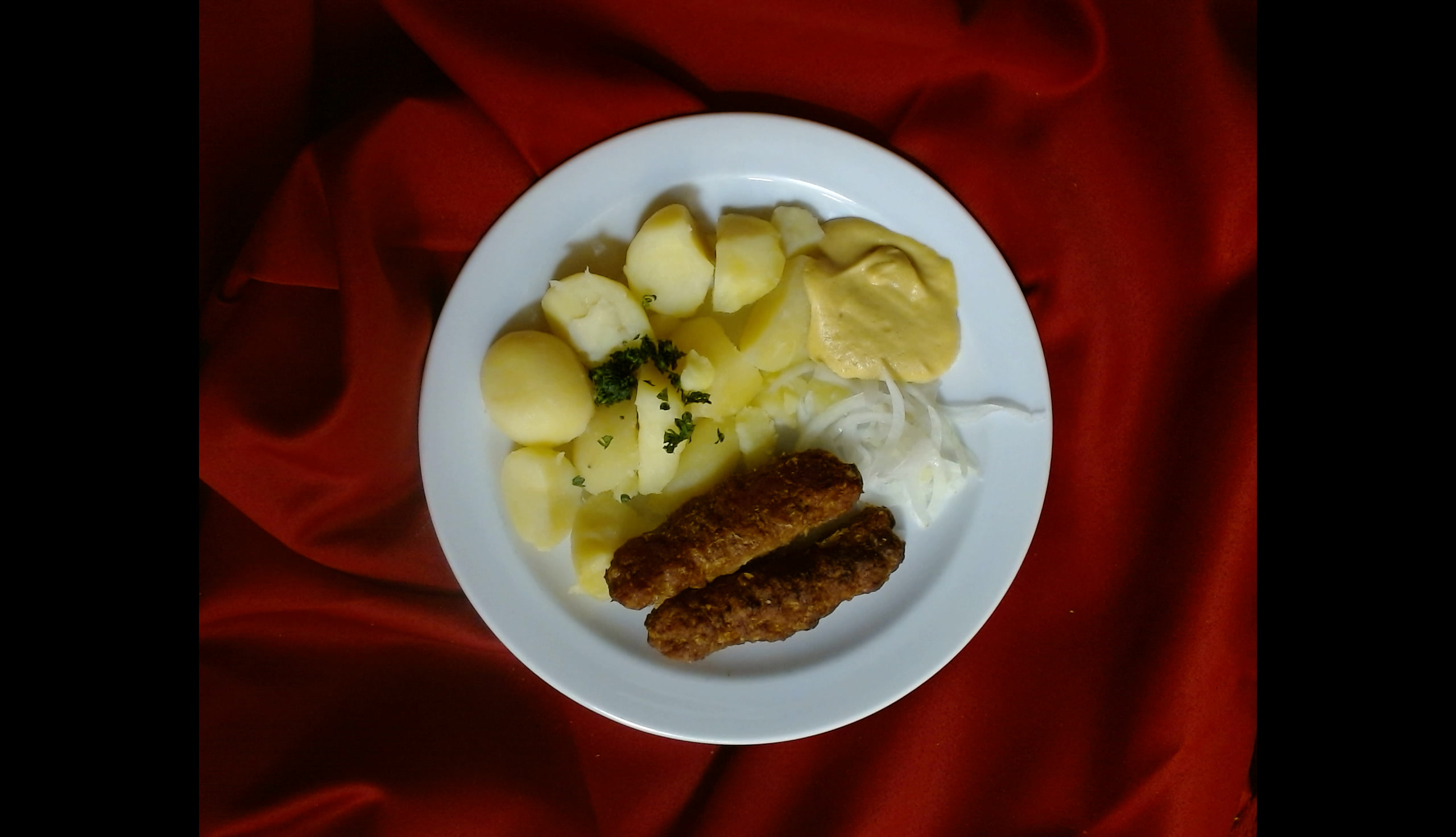Čevabčiči, hořčice, cibule, vařený brambor