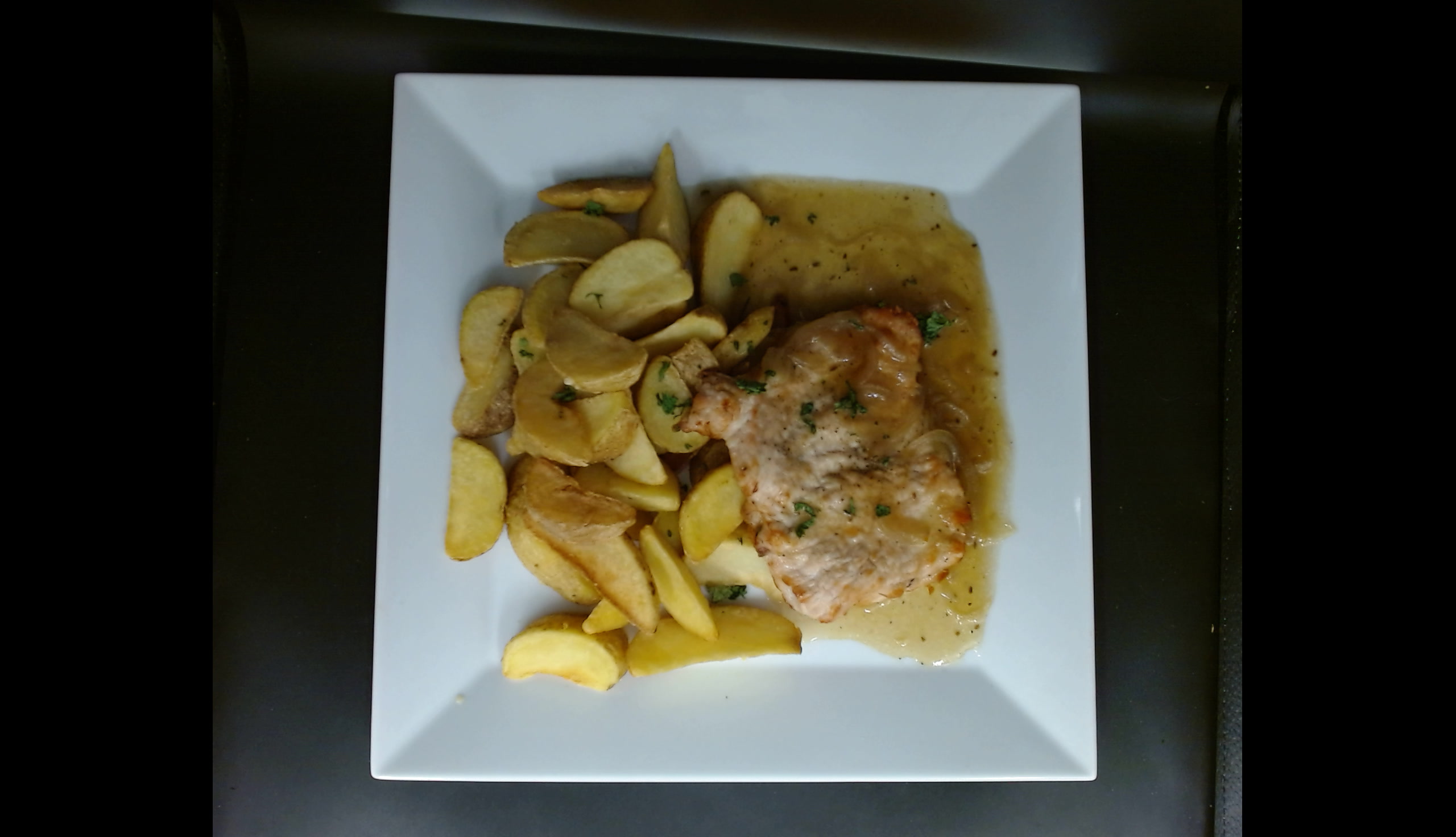 Krůtí steak s cibulovou šťávou, americké brambory