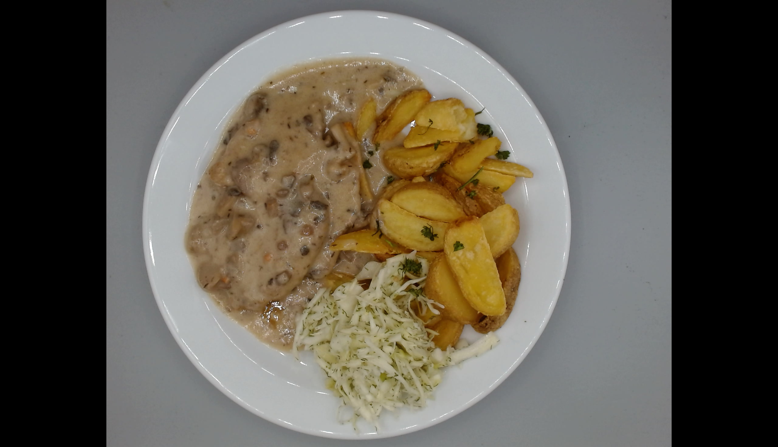 Medailonky z vepřové panenky se smetanovo-houbovou omáčkou, americké brambory, zelný salát