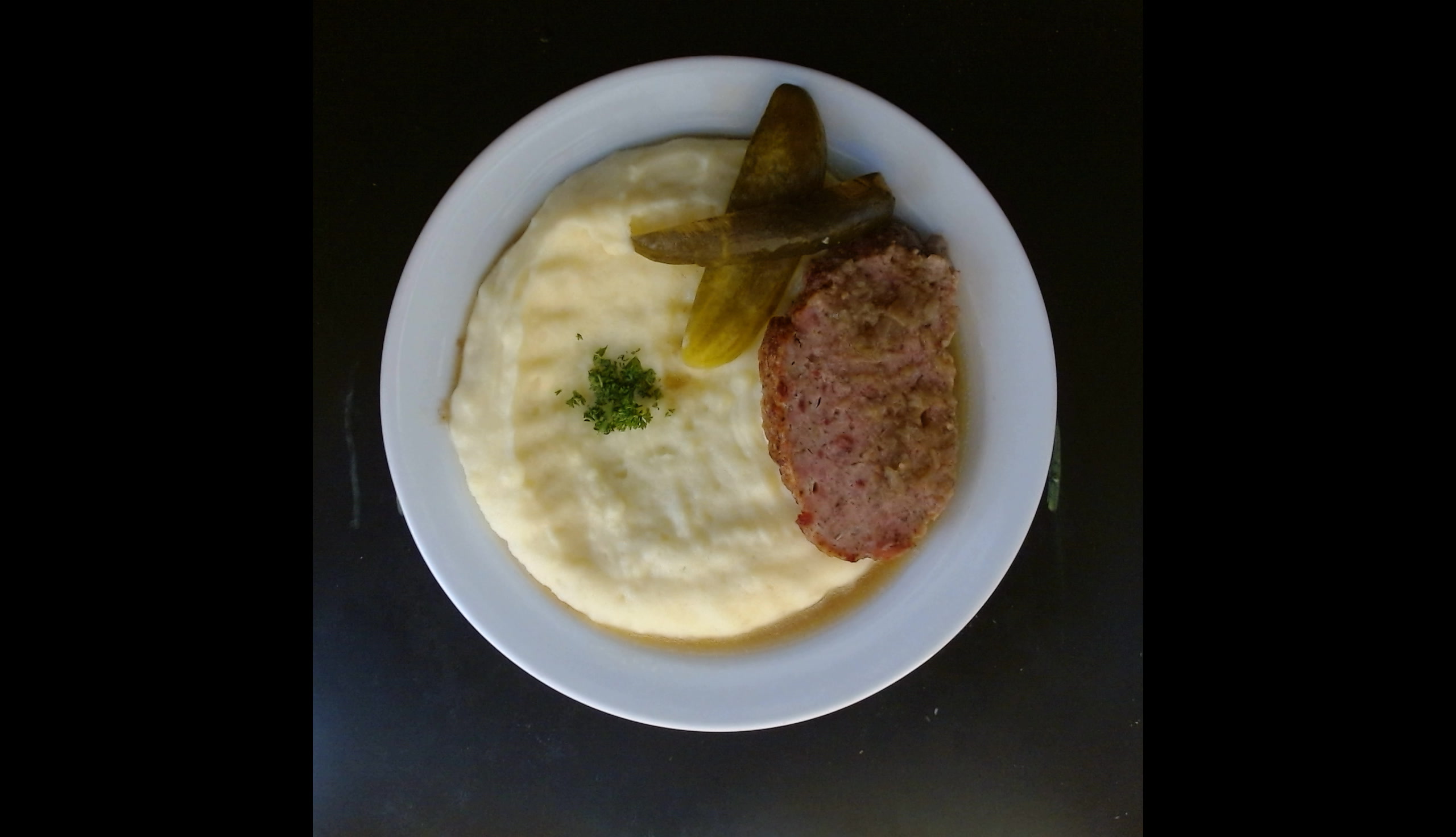 Domácí pečená sekaná, bramborová kaše, okurka
